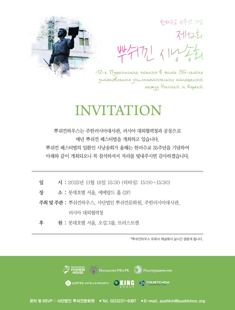 상세보기 2024 뿌쉬낀페스티벌 뿌쉬낀탄생 225주년 기념 더보기 2023년 10월 31일 / 주러시아 한국문화원 제 11회 뿌쉬낀 시 낭송회 뿌쉬낀하우스 출판센터에서는 한·러 수교 35주년을 기념하여 「제12회 뿌쉬낀 시낭송회」를 개최합니다.러시아 대문호 알렉산드르 뿌쉬낀을 기리는 이번 시낭송회는 러시아와의 수교 35주년을 축하하고 양국 문화 교류의 의미를 되새기는 뜻깊은 자리가 될 것입니다. 일시: 2025년 11월 18일(화) 15:30 (티타임: 15:00~15:30)장소: 롯데호텔 서울, 에메랄드 홀 (2F) 주최 및 주관: , 사단법인 뿌쉬낀문화원, 주한러시아대사관, 러시아 대외협력청 후원: 롯데호텔 서울, 오킹그룹, 트러스트캠 한국 전통 민화 특별전 '2025 색채의 향연' 2025년 7월 25일부터 9월 26일까지 주러시아 대한민국 대사관 한국문화원에서 한국 전통 민화 특별전 ‘2025 색채의 향연’이 개최됩니다. 전시회 개요:전시 제목: ‘2025 색채의 향연’기간: 2025년 7월 25일 ~ 9월 26일장소: 주한 러시아 문화원러시아 모스크바 아르바트 거리 24, 3층 (전시실) 자세히보기 뿌쉬낀 탄생 225주년 기념 전시 Мир Пушкина (뿌쉬낀의 세계)2024년은 러시아 문학의 거장 알렉산드르 세르게예비치 뿌쉬낀이 탄생한 지 225주년이 되는 해입니다. 이를 기념하여 사단법인 뿌쉬낀문화원은 배재학당 역사박물관에서 특별 전시 뿌쉬낀의 세계를 개최합니다.이번 전시는 뿌쉬낀의 삶과 예술 세계를 깊이 탐구하며, 그의 작품과 시대를 재조명하는 뜻깊은 자리로 마련되었습니다. 전시를 통해 동서양 문학과 예술이 교차하는 지점을 발견하고, 그의 작품이 오늘날까지도 남긴 깊은 울림을 느껴보시기 바랍니다. 전시회 개요:전시 제목: 뿌쉬낀의 세계 (Мир Пушкина)기간: 2024년 12월 4일(수) ~ 2025년 1월 31일(일)장소: 배재학당 역사박물관관람 시간: 10:00 ~ 17:00 (입장 마감 시간: 16:00)휴관일: 일요일 및 월요일 자세히보기 민화 전시 <한국의 여름 - 연꽃> 모스크바 2024년 8월 22일, 모스크바 갤러리 글라자미 후도즈니카에서 개막한 민화 전시 <한국의 여름 – 연꽃>이 성황리에 개최되었습니다. 개막식에는 주러한국문화원의 박정곤 원장님을 비롯한 다수의 귀빈들이 참석하여 자리를 빛내주셨습니다. 이 전시는 한국의 전통 미술을 러시아 관객들에게 소개하고, 문화 교류의 장을 마련하는 소중한 기회가 되었습니다. 자세히보기 벨라루스 국립미술관 초청전 사단법인 뿌쉬낀문화원(https://www.pushkincc.org)은 벨라루스 국립미술관에서 ‘한국의 미’를 주제로 한 ‘한국민화 도예전’을 개최했습니다. 이번 전시회는 벨라루스 국립미술관과 뿌쉬낀하우스에서 공동으로 주최하며 2024년 4월 19일 부터 5월 12일 까지 열렸습니다.한국의 전통 문화와 예술을 벨라루스 관람객들에게 큰 관심을 받았습니다. 자세히 보기 삶이 그대를 속일지라도 알렉산드르 푸시킨|Александр Пушкин ABOUT US 사단법인 뿌쉬낀문화원에 방문해 주셔서 감사합니다. 뿌쉬낀문화원은 2002년에 개원한 교육문화센터 뿌쉬낀하우스에 근거하여 2021년 새롭게 탄생하였습니다. 뿌쉬낀문화원은 다양한 활동들을 통해 민간 차원의 한러교류를 더욱 잘 이끌어낼 것을 약속드립니다.러시아를 사랑하는 많은 분들의 적극적인 참여를 부탁드립니다. 이사장 김선명 이사장 인사말 제11회 뿌쉬낀 시낭송회 2024년 11월 25일 / 롯데호텔 에메랄드홀 자세히 보기 공지사항2024년 공익법인 결산서류 공시 및 공입법인 출연재산 보고서2023년 기부금 모금액 및 활용실적 명세서2023년 공입법인 출연재산 보고서2022년 기부금 모금액 및 활용실적 명세서2022년 공입법인 출연재산 보고서